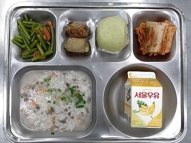 조식: 쇠고기야채죽, 건새우마늘쫑볶음, 수랏간고기말이, 배추김치, 새싹순보리쌀찐빵, 바나나우유