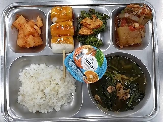 석식: 현미찹쌀밥, 아욱된장국, 삼치조림, 치커리사과무침, 빙빙소떡꼬치, 깍두기, 쁘띠첼