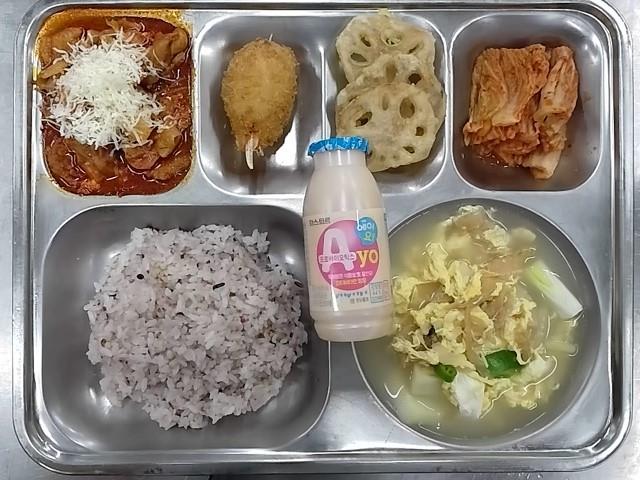 중식: 혼합잡곡밥, 북어채감자국, 치즈불닭, 맘집게다리맛살, 연근튀김, 배추김치, 요구르트