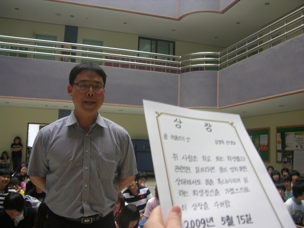 위 사람은 학교의 모든 학생들과 관련된 일이라면 몸이 성치못한 상태에서도 몸을 혹사시키며 일하는 희생정신을 가졌기에...."