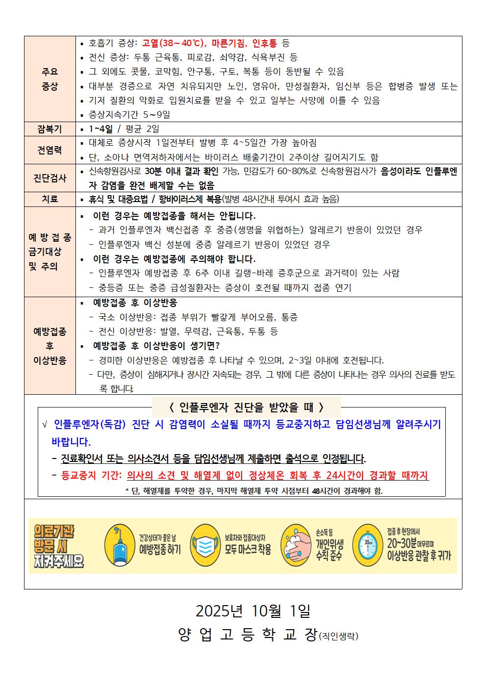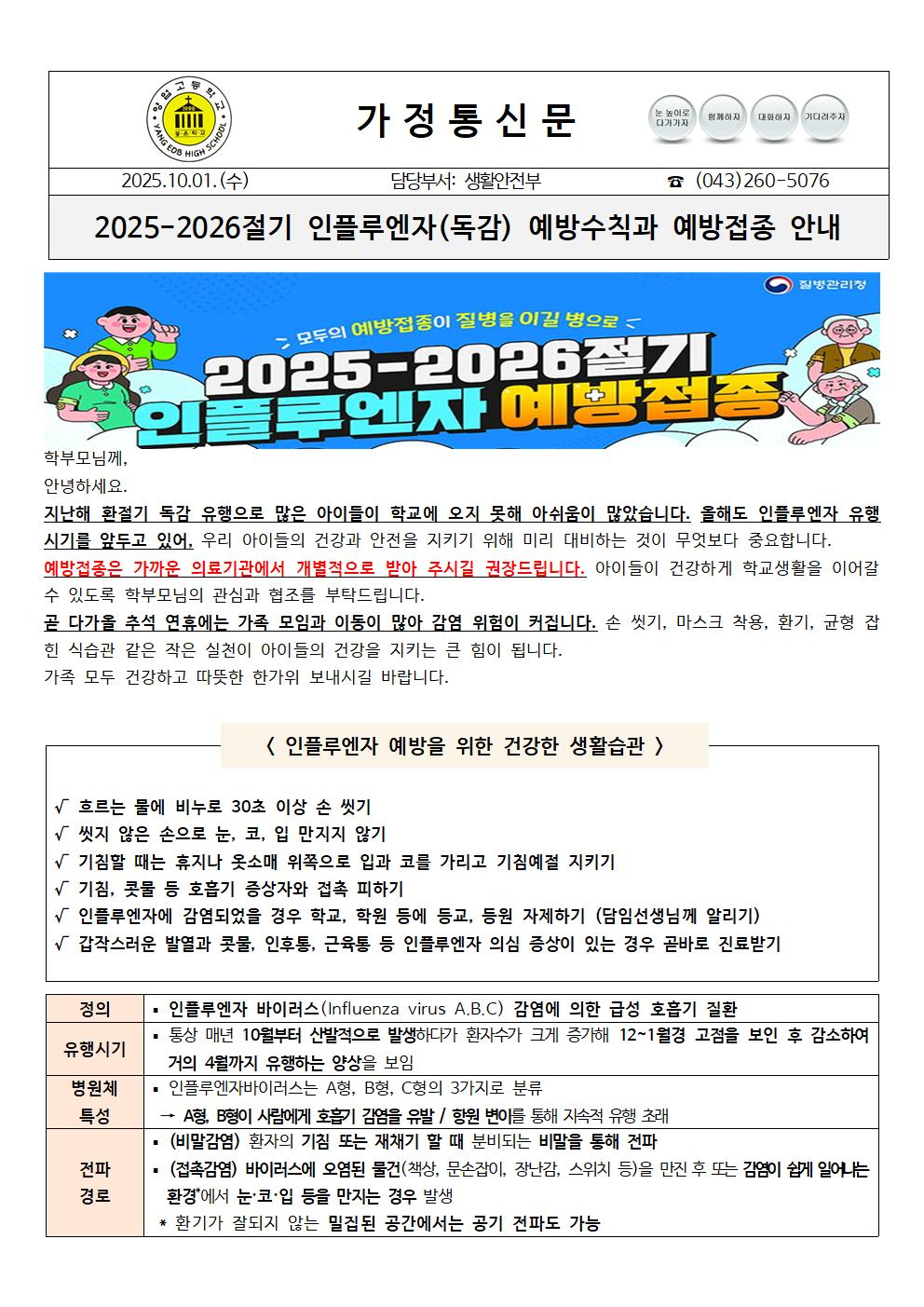 학부모님께인플루엔자 유행 관련 안내문을 공지합니다~지난해 독감 유행으로 많은 학생들이 등교하지 못한 아쉬움이 있었습니다. 올해는 같은 어려움이 반복되지 않도록 가까운 의료기관에서 인플루엔자 예방접종을 꼭 받아 주시길 부탁드립니다. 가정에 건강과 평안이 함께하는 따뜻한 한가위 보내시길 바랍니다.